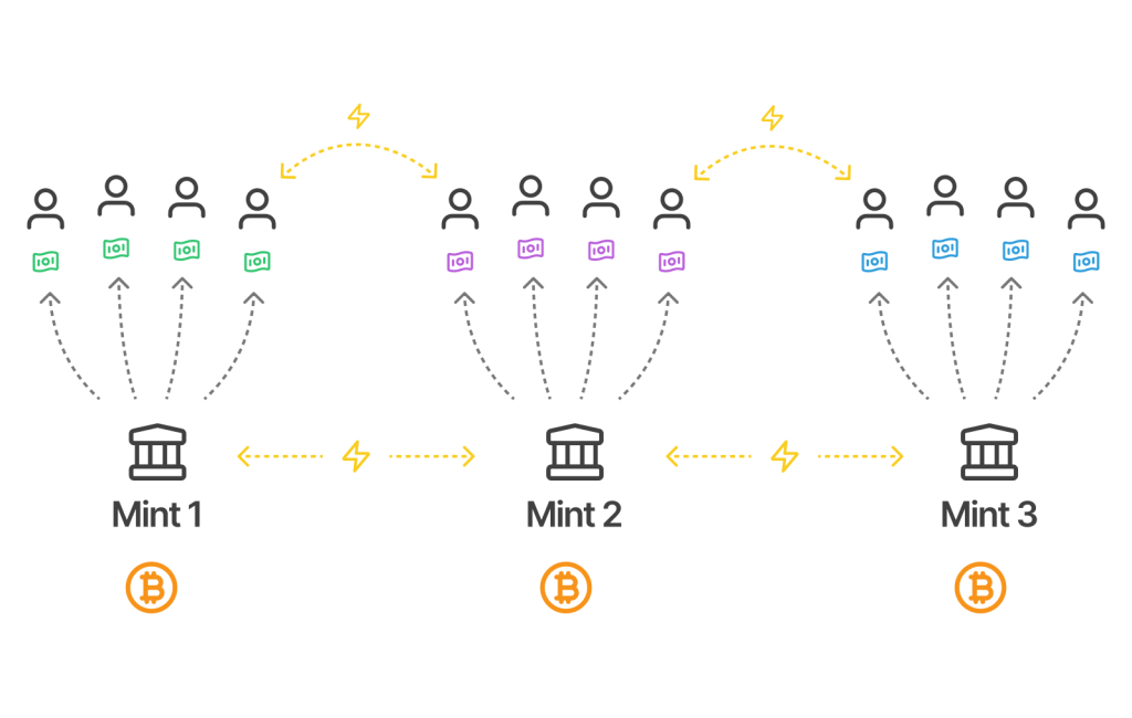 Trois monnaies gèrent les jetons ecash pour les utilisateurs, connectés par le réseau Lightning.
